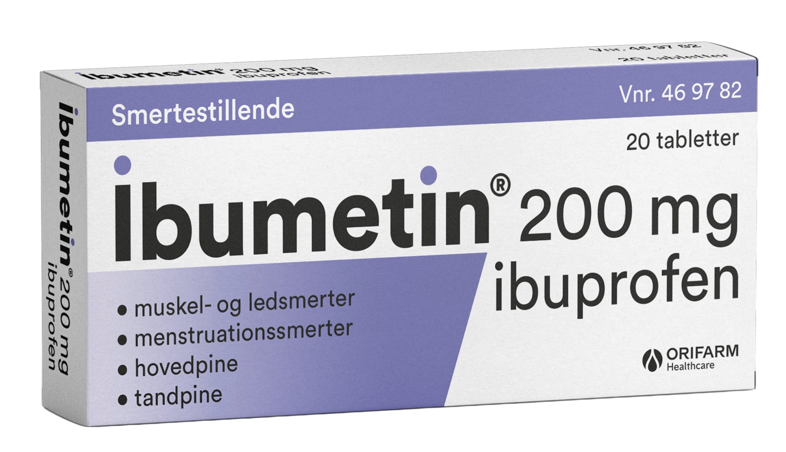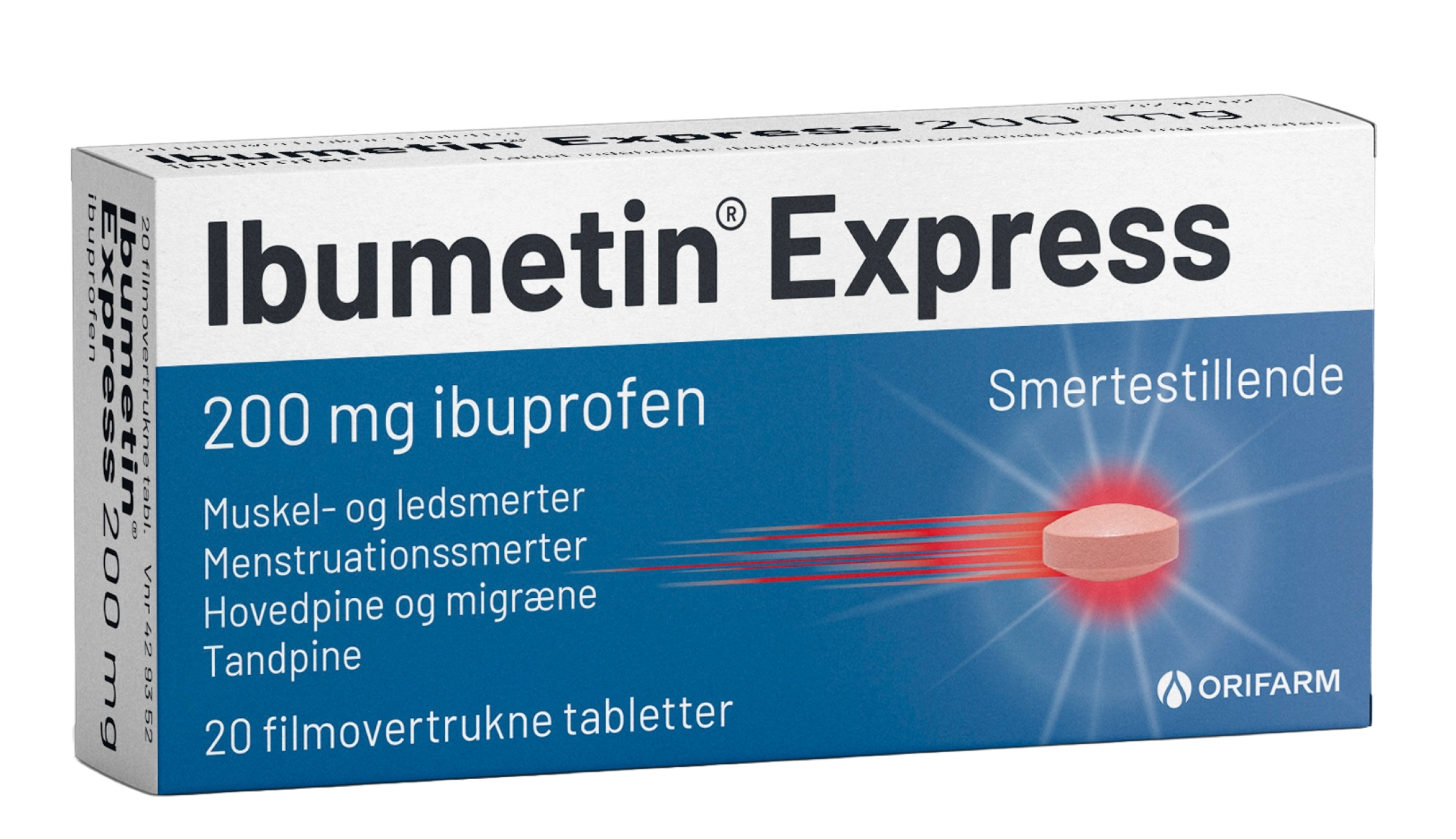 Ibumetin Express® filmovertrukne tabletter, 200 mg (ibuprofen). Anvendelse: Svage til moderate smerter samt feber. Dosering: Fra 12 år (> 40 kg): 1-2 tabletter, kan gentages hver 4. time, dog højst 6 tabletter i døgnet. Kontakt læge, hvis du har brug for Ibumetin i mere end 3 dage eller hvis symptomerne forværres. Må ikke anvendes: ved allergi overfor nogle af indholdsstofferne, acetylsalicylsyre eller andre NSAID-lægemidler, hvis du tager andre NSAID-lægemidler, har aktiv/tidligere blødning, hul eller sår i mave-tarm-kanalen, tidligere astma eller vejrtrækningsbesvær, væskeophobning under huden, nældefeber, Crohns sygdom, tendens til blødninger, har en aktiv blødning, er blevet eller snart skal opereres i hjertet, lider af alvorlig dehydrering, svært nedsat hjerte-/lever-/nyrefunktion, er gravid i de sidste tre måneder af graviditeten. Forsigtighedsregler: Kontakt lægen ved hjerteproblemer, tidligere slagtilfælde, dårligt blodomløb i benene eller fødderne, forhøjet blodtryk, sukkersyge, forhøjet kolesterol, rygning, allergier, høfeber, astma, kronisk hævelse af næseslimhinden, har eller har haft en tarmsygdom, bindevævssygdommen (SLE), hos ældre, ved behandling med vanddrivende lægemidler, lægemidler der påvirker nyrerne, porfyri, har problemer med den normale blodstørkningsmekanisme, næsepolypper eller lungesygdommen KOL, umiddelbart efter en større operation, ved amning, de første 6 måneder af graviditet samt ved forsøg på at blive gravid, ved alvorlige hudreaktioner, ved hyppige eller daglige hovedpineanfald under behandlingen. Indtagelse af alkohol bør undgås. Ibumetin kan maskere tegn på infektion. Anbefalet dosis og behandlingstid bør ikke overskrides. Brug af anden medicin: Spørg lægen eller på apoteket før du tager Ibumetin Express sammen med andre lægemidler. Overdosering: Livstruende forgiftning kan opstå. Søg straks læge. Bivirkninger: halsbrand, opstød, mavesmerter, kvalme, opkastning, luft i maven, forstoppelse, diarré. Kontakt læge ved sort, tjæret afføring eller blodfarvet opkast, hævelse af ansigt, tunge eller svælg, allergisk reaktion med åndenød, alvorligt udslæt med f.eks. blærer på huden, feber, hævede lymfeknuder, rødt og skællende udslæt med knuder under huden og blæredannelser, brystsmerter, fordøjelsesbesvær, sløret syn, synstab, vand i lungerne. Pakning: 20 stk. Læs indlægssedlen i pakningen inden brug. Orifarm Healthcare A/S, Energivej 15, 5260 Odense S. SPC: 6. november 2024.
